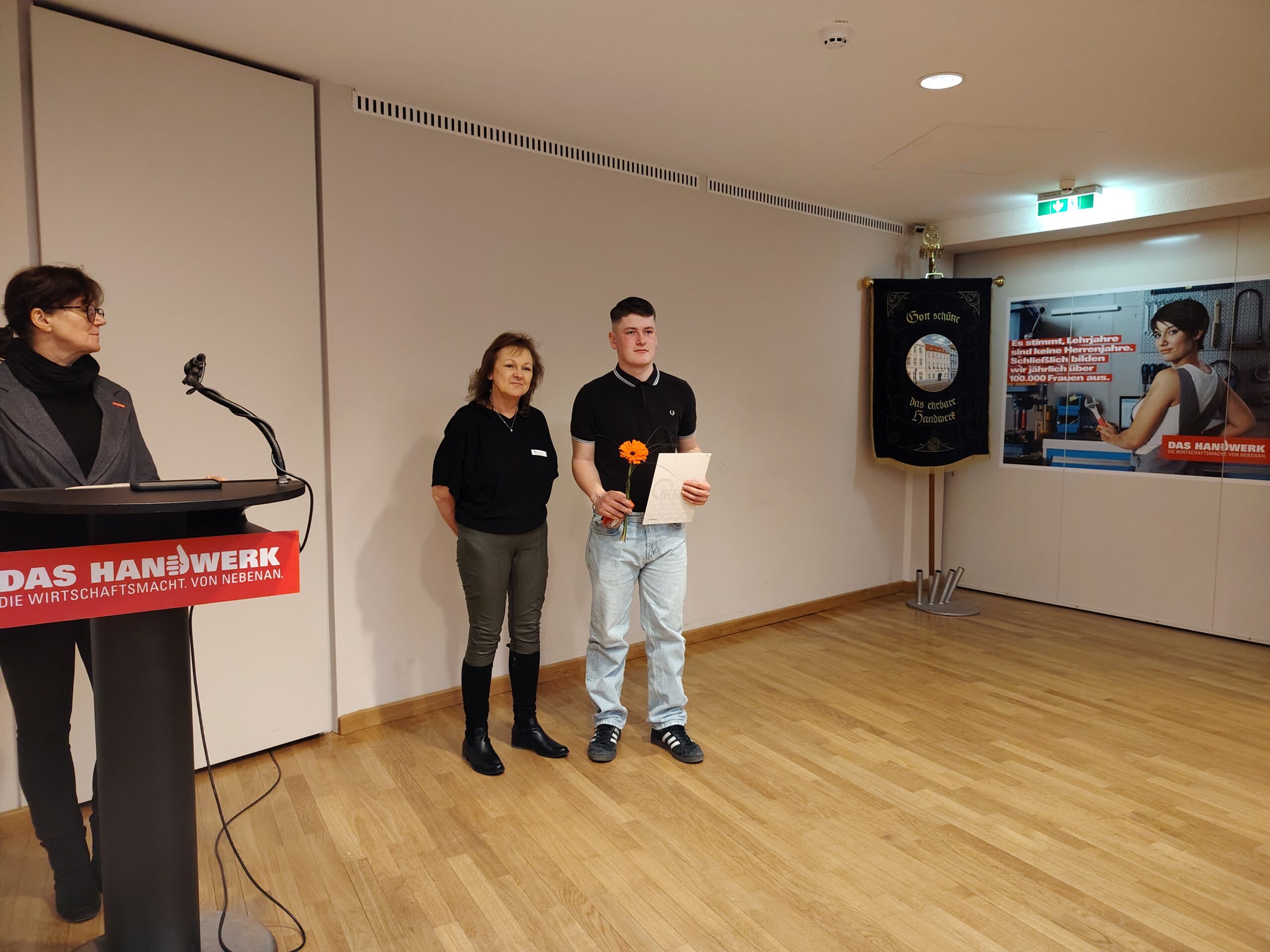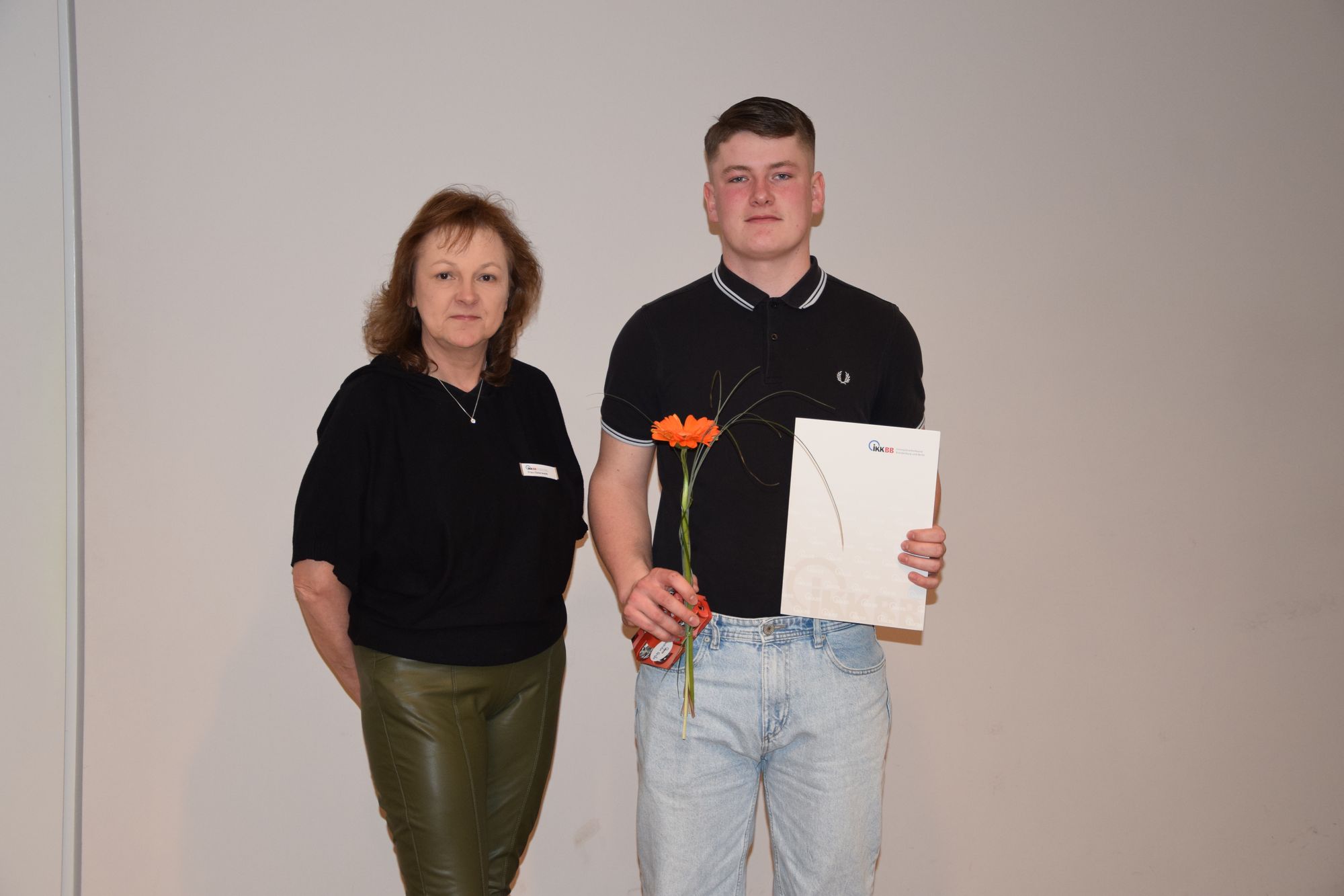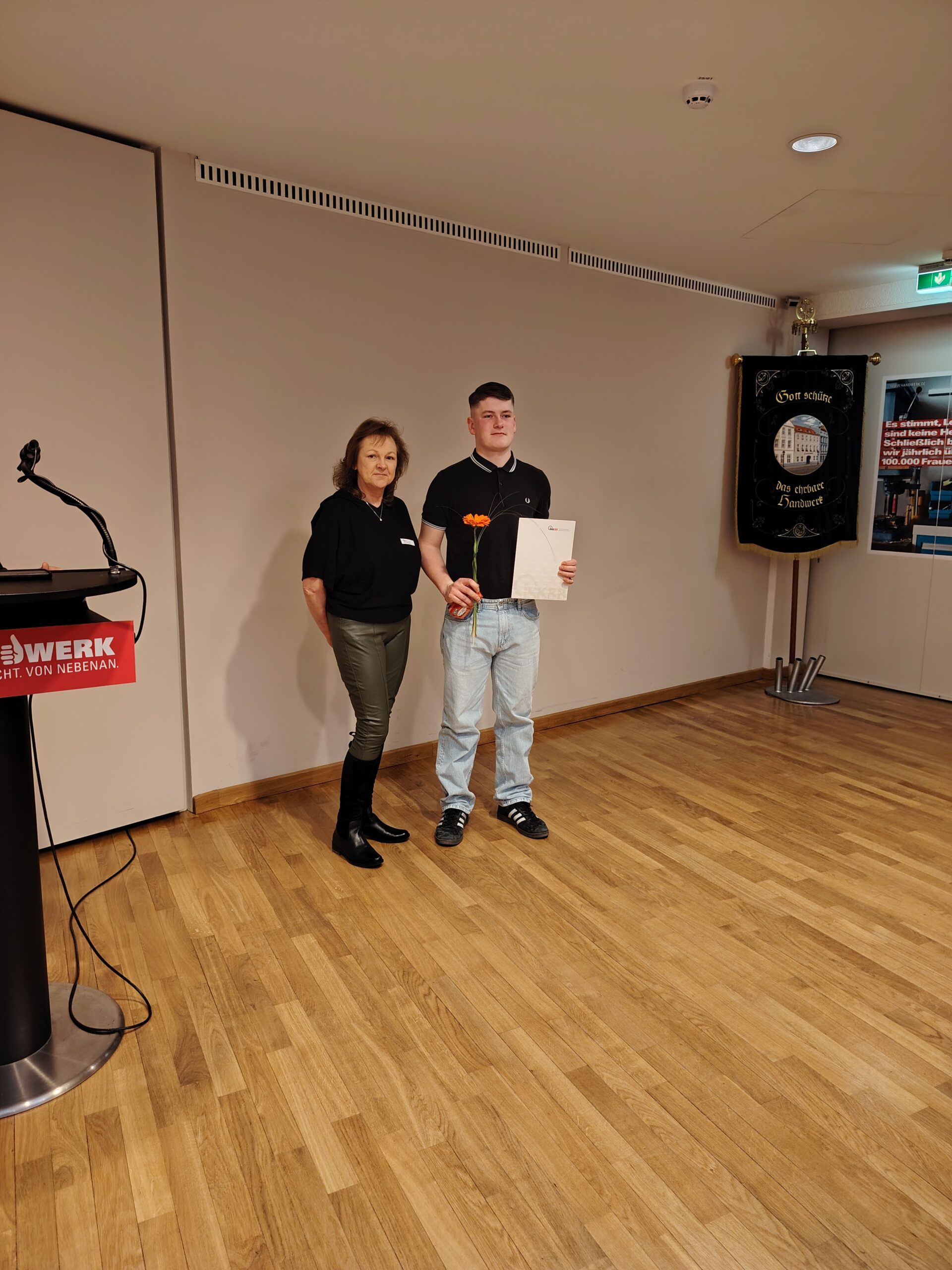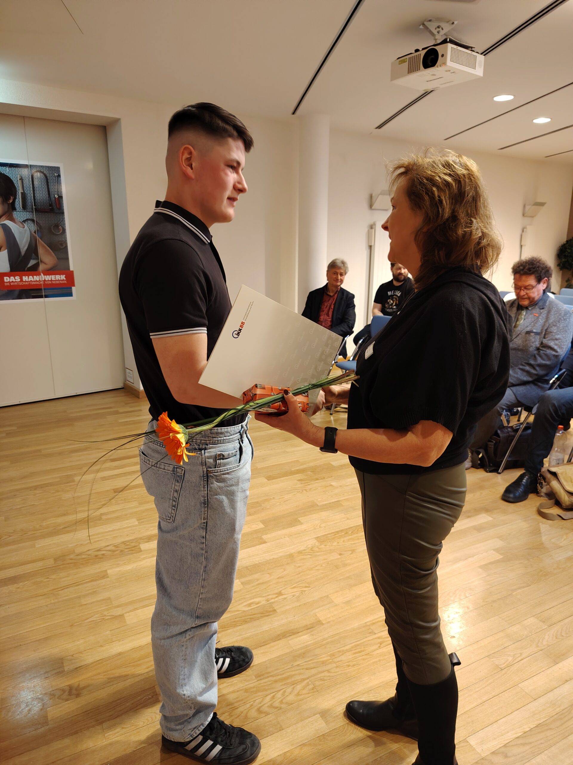 Aus dem SHK-Handwerk konnte ein Geselle ausgezeichnet werden. Er hat mit der Gesamtnote 2 abgeschlossen. Die Auszeichnung nahm Frau Osterwald von der Innungskrankenkasse Brandenburg und Berlin vor.